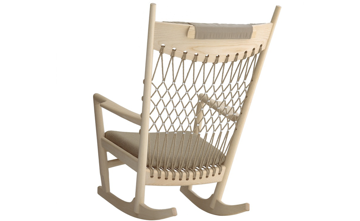 Rocking Chair(摇椅)是大师Hans J. Wegner设计的众多摇椅中的经典之作。摇椅具有简洁的线条,精准的的人体工学结构,是Hans J. Wegner在1944年为身怀六甲的妻子设计,扶手前端微微向外展开,是为让妻子方便起身。实木制成,轻便耐用,简约单纯,仍于潮流中立于不败之地,为Hans J. Wegner最受欢迎的经典作品之一。我们已经能从中感受到圈椅的影子。摇椅水曲柳制作,坐垫麻布软布(内部填充优质海绵),棉绳编织(有白色,黑色,棕红色可选)。