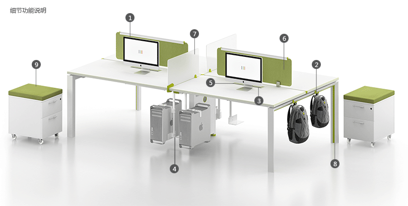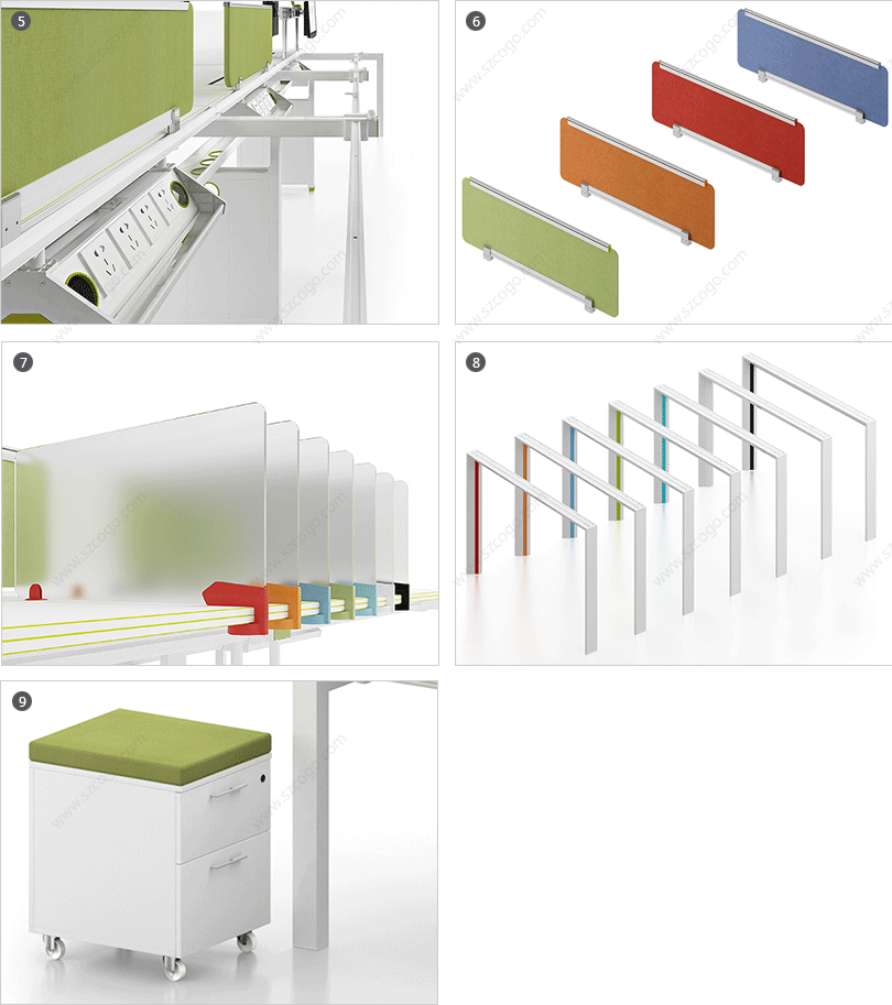 5、台下过强弱电过线系统。 6、桌面吸音隔板,多选人性化颜色可选。