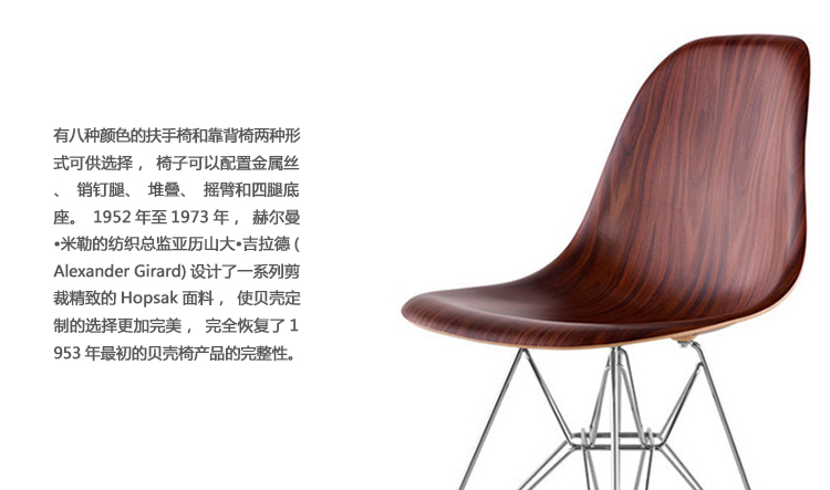 本单品为Eames Plastic Chair 系列成员之一,舒适的椅座外观设计是以添加了玻璃纤维强化的塑料来制作,再搭配上各式不同的脚座来增添使用的多样化,值得一提的是Eames Plastic Chair 的创新技术与材质,便它得以成为全世界第一张被大量制造的单椅。拜现今创新的科技所赐,全系列的Eames Plastic chair 终于再次制造,使用环保可回收的聚丙烯材质,求制作线条优美的椅座外壳,不但重量更轻,同时更具有更好的耐热性及抗化学性。