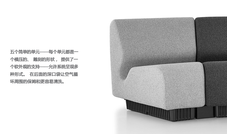 五个简单的单元——每个单元都是一个模压的、雕刻的形状,提供了一个软外观的支持——允许系统呈现多种形式。在后面的深口袋让空气循环周围的保姆和更容易清洗。可在各种纺织品,每件都有充分的前,后,和侧面的软垫,所以它可以作为结束,内部,或独奏座椅,无论安排。单元用简单的连接器安全地连接在一起,并解锁以快速重新排列。