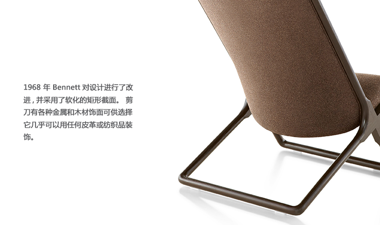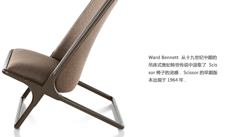 Ward Bennett从十九世纪中叶的吊床式贵妃躺椅汲取灵感,设计了Scissor座椅。最早的Scissor座椅出现于1964年。1968 年,Bennett改良了设计,选定了更加柔软的长方形椅面。Scissor座椅备有多种金属饰面;几乎也可以用所有皮革或织面装饰。