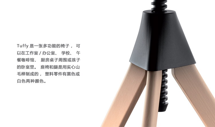 Tuffy基于最初的Tom&Jerry凳子,使用相同的尼龙纺锤高度调整。这张椅子有四条腿(而不是凳子的三条腿)和一个T形靠背,它是由注入气体的塑料制成,以提供舒适的弹性。Tuffy是一张多功能的椅子,可以在工作室/办公室、学校、午餐咖啡馆、厨房桌子周围或孩子的卧室里。座椅和腿是用实心山毛榉制成的,塑料零件有黑色或白色两种颜色。
