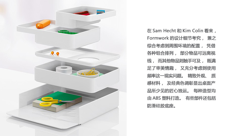 考虑到占据家庭及办公室空间的笨重物品的存放问题,Sam Hecht和Kim Colin设计了具有可拆卸盖子的储物盒。每个盖子上设计有孔洞,可供放置移动式笔筒。或者,笔筒可固定于储物盒内部孔洞下方压槽中,从而在无需打开盖子的情况下便可接触杯中物品。