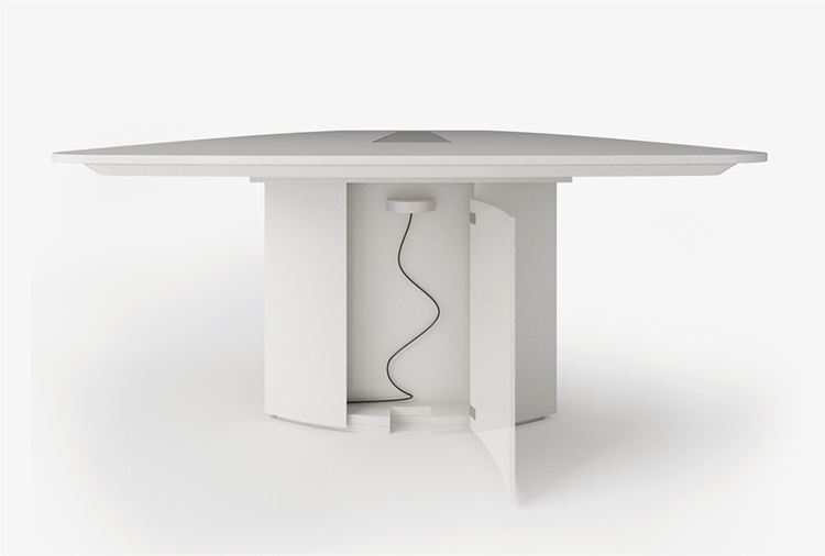 船形或椭圆形为基本形状的高级会议桌。优雅的外形之下,椭圆形、直线形桌腿或整体的桌下机构,可完美收纳走线及隐蔽多媒体设备。中央多媒体槽完美的整合了投影设备和多媒体接口。表面材料可选白色特殊树脂,实木贴面,烤漆和层压板。
