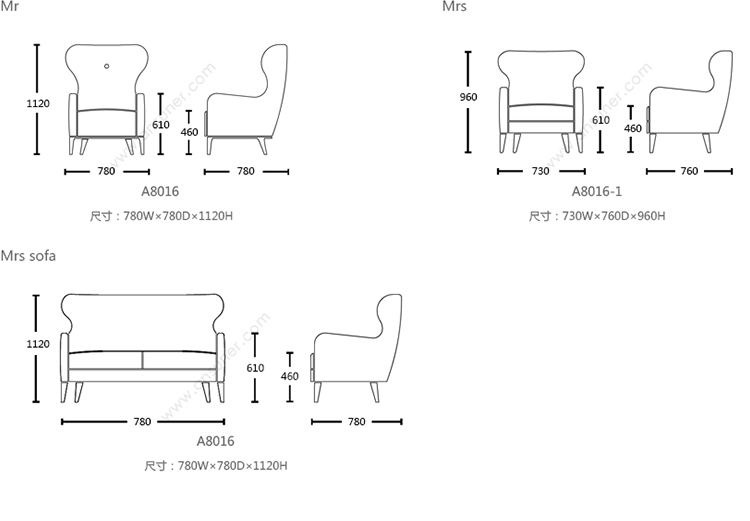 Mrs sofa 系列尺寸/示意图