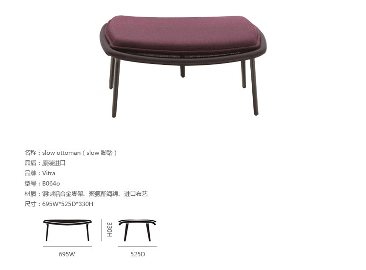 由Ronan 和Erwan Bouroullec 的设计组合打造,出自2007 年的作品,Slow Chair 为一款结合多种精致工法的设计作品,金属加弯勾勒出椅子主体,再以高科技的纺织样貌加以包覆,完成了椅背和座椅的形貌勾勒后,看似坚硬的印象,却在网状的织面结合下,兼富坚固,却保有弹性舒适的乘坐体验。然而,在座椅处,更加上了柔软的聚酯、羊毛坐垫,让整体舒适度,再向上提升一层。降低乘坐高度的设计,让Slow Chair 在搭配椅凳之后,又是休闲椅,又宛如一张让人放松的Lounge Sofa,由您去定义最适切的乘坐方式。在午后,在闲适的美好时光,好不令人陶醉。Slow Chair 极致轻量的风格打造,让您讶异于家具工业的快速演进和丰沛创意。坐垫卸下、和靠枕搭配,尽如你意,带来多种可能的使用乐趣。Slow Chair 四种色款,搭配内容如附图,无法另外客制订购,请依您所喜爱样式,挑选订购,每张Slow Chair 内含座椅、坐垫、及靠枕两件;此外,椅脚有深紫漆面或抛光亮银两种选择。