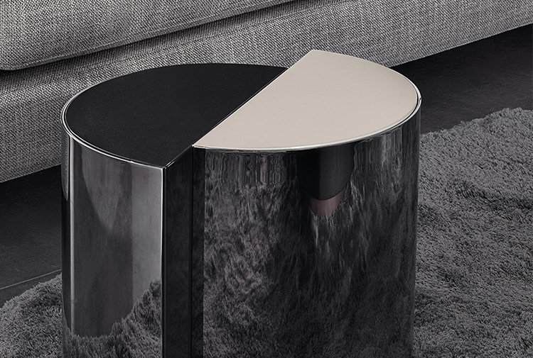 盾牌桌子上有一个强烈的雕塑印记,让人想起70年代的当代雕塑。它被设计成一个几何体积,圆柱体的形状被分成两个偏置的部分,并用一个带有黑色镍涂层的弧形钢板的屏蔽来补充。