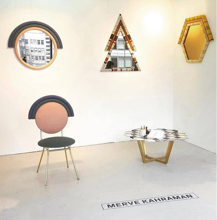 Pontiac Hexagon(庞蒂亚克六边形镜)具有美国核桃和金色镜面的鲜艳色彩。几何图案KvADRAT织物已经对称地切割和手工制作的木材和泡沫。这种复古风格的印花和色彩搭配与黑核桃相配,给人一种朴实的感觉。这些意外的独特镜子也可以定制。
