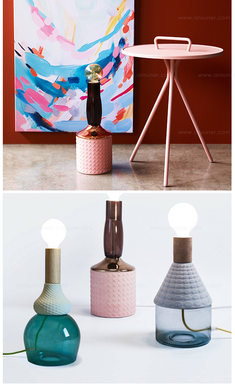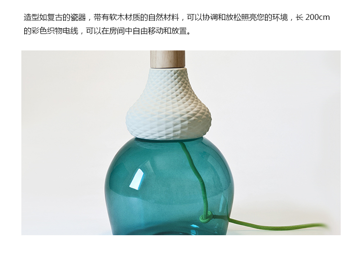 造型如复古的瓷器,带有软木材质的自然材料,可以协调和放松照亮您的环境,长200cm的彩色织物电线,可以在房间中自由移动和放置。