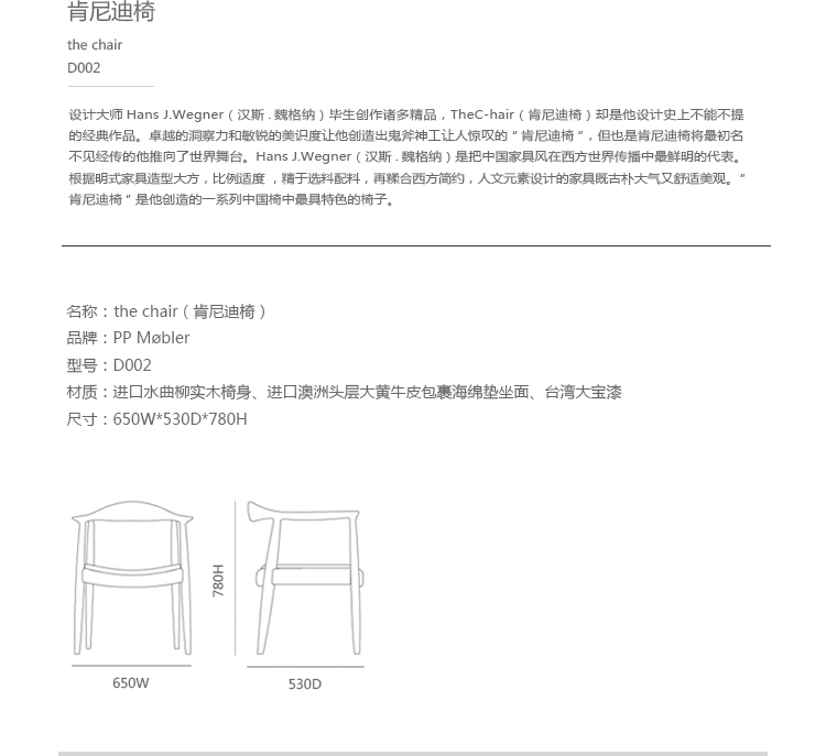 汉斯·韦格纳的设计很少有生硬的棱角,转角处一般都处理成圆滑的曲线,给人以亲近之感“肯尼迪椅”的设计就是如此。它拥有流畅优美的线条,呈半圆的扶手和扁平宽厚的椅身加上精致的细部处理,躺着让人舒适安逸,坐着却有着唯我独尊的气魄。