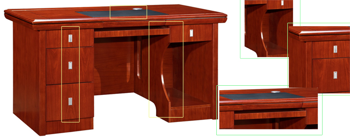 ※  上图将此款职员台精湛的细节部位另行罗列,例如隐藏式铝合金拉手,按下拉出,实木的收纳式键盘架,镶嵌式梯形皮垫,台面双色分线条,跑道型过线孔,弧度收边,外形精致美观!!