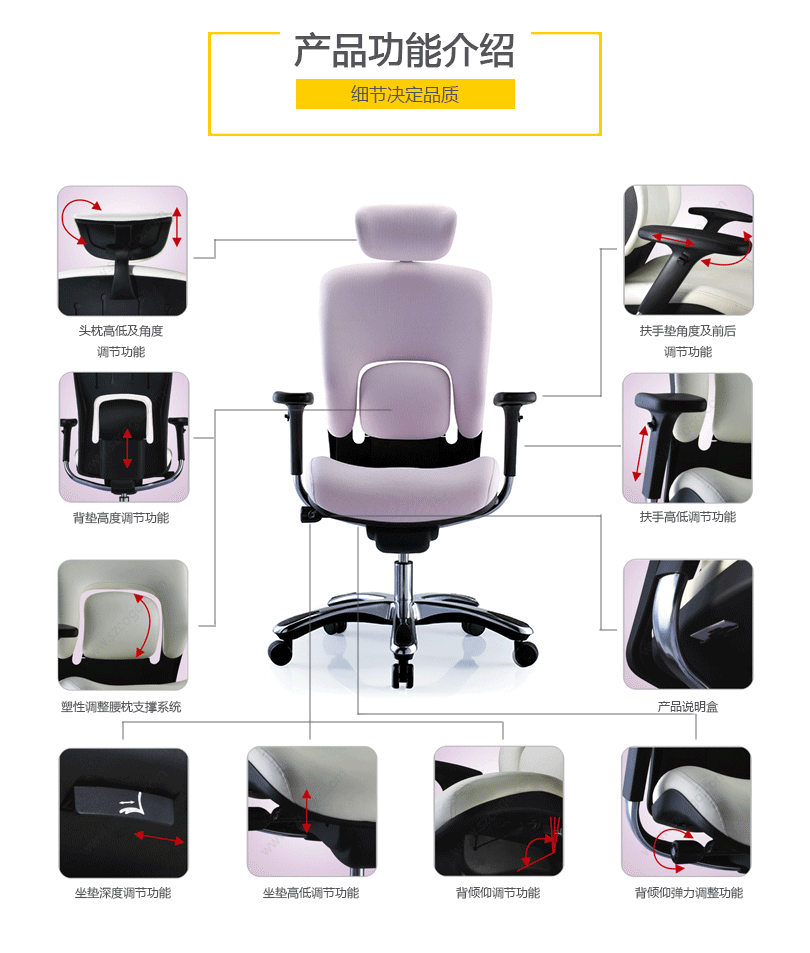 "金爵系列采用独特的分离式腰枕设计,并使用塑胶的特性达成调整的功能,提供使用者最佳的腰部支撑。"