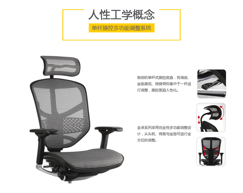 金卓的优美设计有利于持久的舒适和美感。工学椅的结构和功能利用同步倾仰底盘控制功能锁定,滑座和高度调节。高度和角度均可调的扶手和头枕都包含在这张特有的工学椅里。
