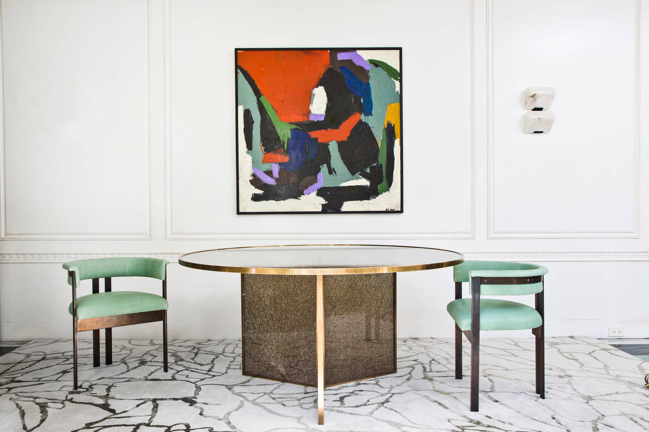 这款引人注目的现代餐桌拥有精美的纹理,融合了原始和精致的元素。 每块钢化玻璃都是手工破碎的,创造了材料的并置与优雅的古董黄铜封边条。