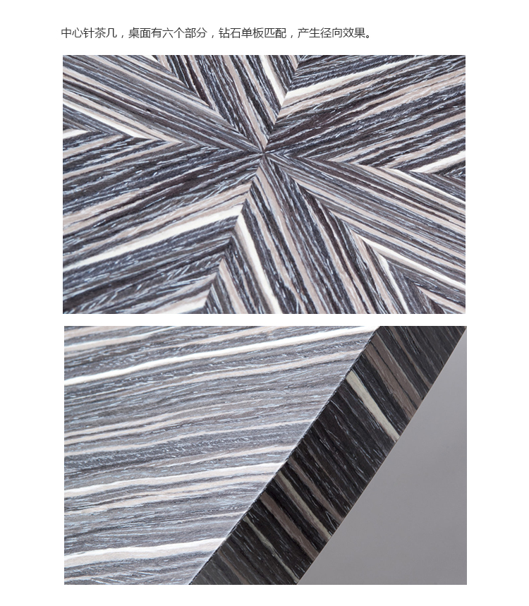 桌面有六个部分,钻石单板匹配,产生径向效果。 桌脚有一个大型铸造金属脚。