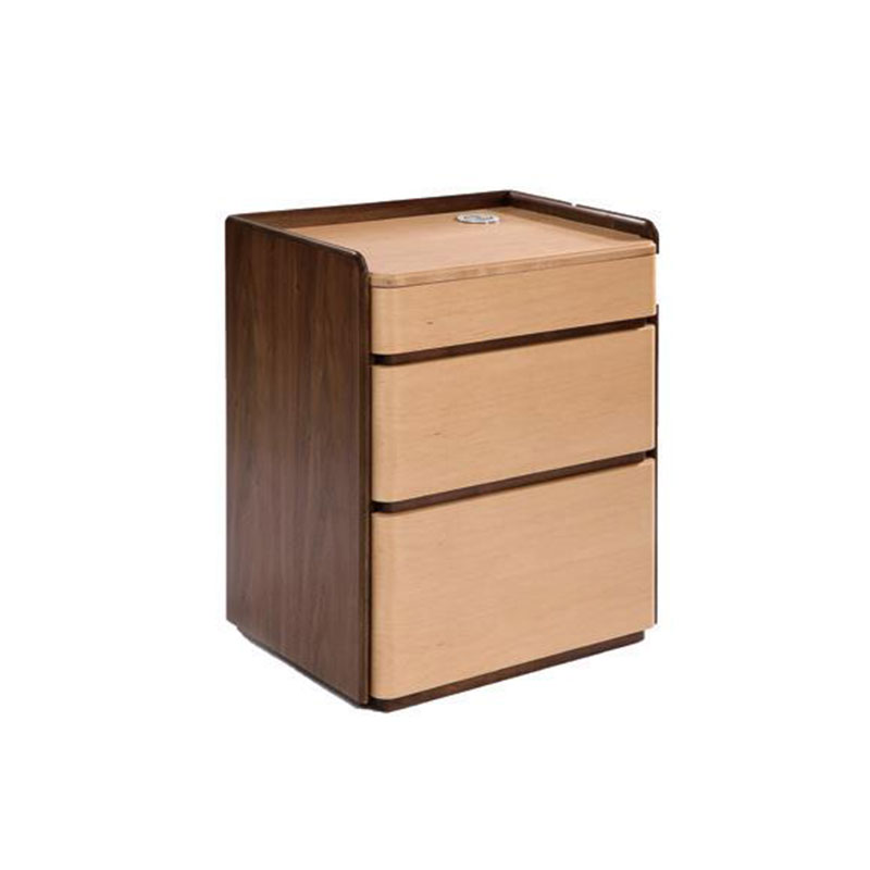 床边柜造型现代简洁优雅,三面围边稍高于柜体面板,以防止物品的掉落。三个抽屉的床头柜用于主卧,配备无线充功能,两个抽屉的床头柜用于客卧,也可以混搭使用。