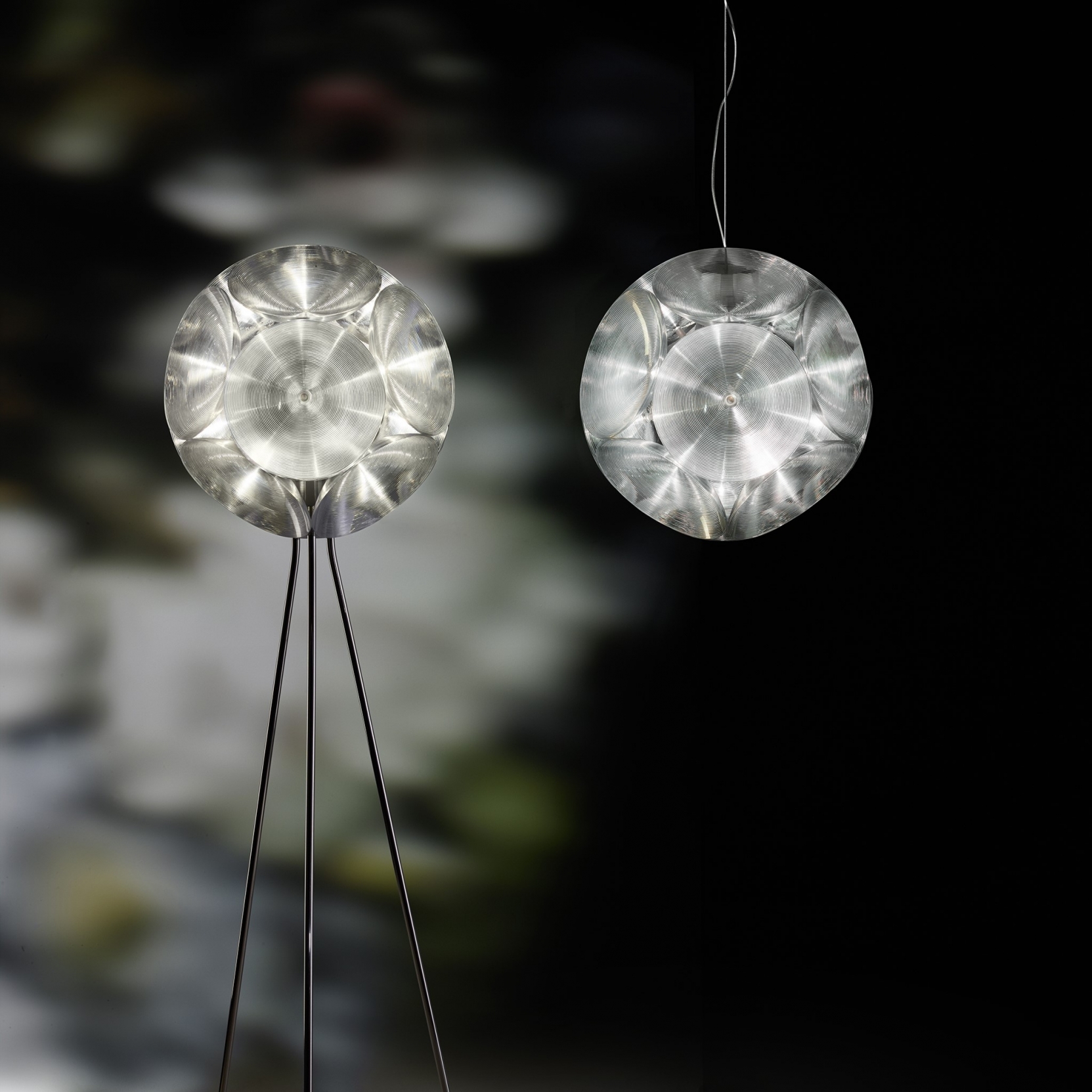 在常规十二面体的每一侧,Hutten都放置了一个圆形反射器。 结果是一个有趣的3D对象,你看到的每个角度不同变化。 丰富的物体,为空间提供了大量的氛围。 无论是悬挂版还是落地版。
