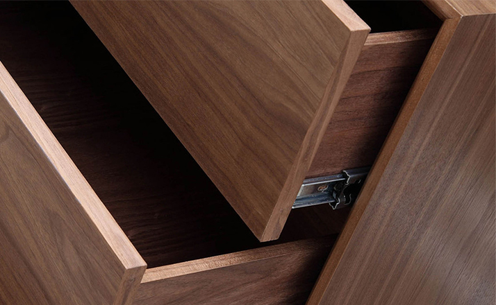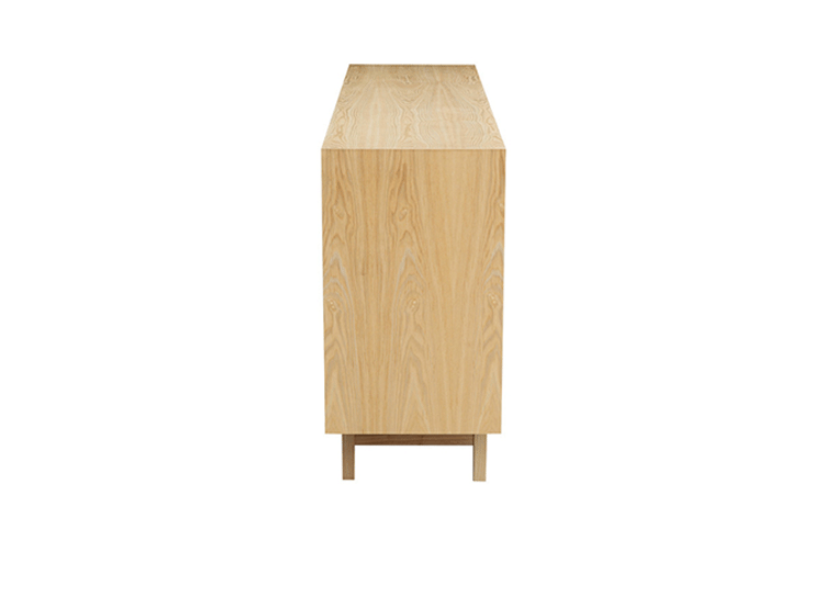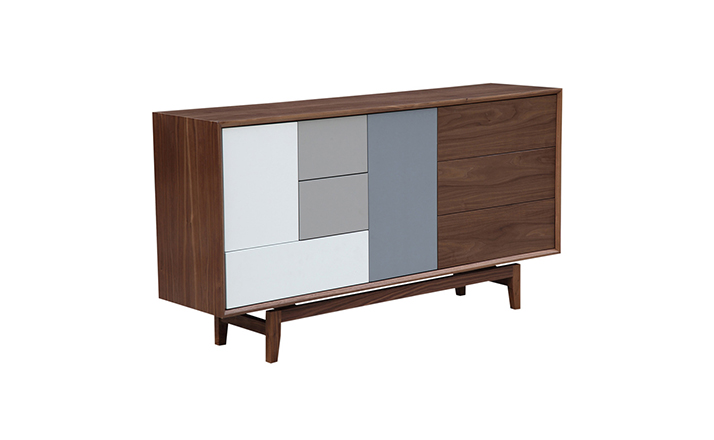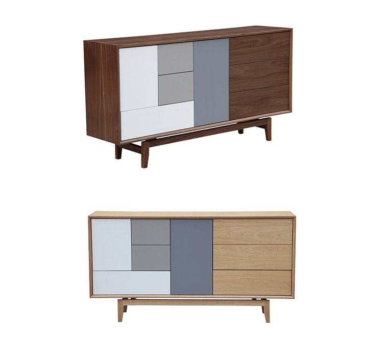 “platform sideboard(平台餐具柜)是Kardiel公司制作的经典实木家具,有着迷人的中世纪设计风格和当代形式巧妙融合,餐具柜主体平台由三个胡桃木单板抽屉和不同色调三聚氰胺组合面临抽屉和门组成。在20世纪50年代末,60年代初, Finn Juhl和 Arne Vodder 最先尝试胶木和天然木的组合运用,并流行至今。这是大胆的创新,他们结合传统的新鲜的新兴技术与现代主义的概念。制作采用精选MDF板基材胡桃木或水曲柳木皮贴面、实木脚架、环保油漆喷涂,做工精湛,品质一流。”