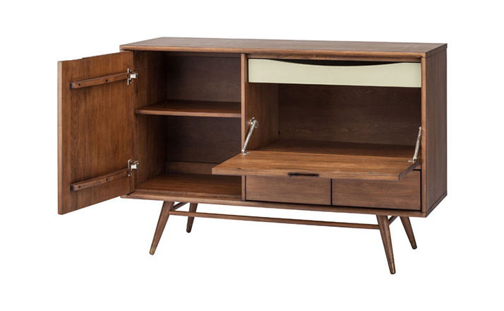 janek sideboard(janek餐具柜)是非常受欢迎的现代斯堪的纳维亚设计,是Kardiel公司制作的经典实木家具,左门具有内部可调式搁板。Finn Juhl和 Arne Vodder 最先尝试胶木和天然木的组合运用。这是大胆的创新,他们结合传统的新鲜的新兴技术与现代主义的概念。制作采用精选MDF板基材胡桃木或水曲柳木皮贴面、胡桃实木或水曲柳实木脚架、环保净味油漆喷涂,做工精湛。