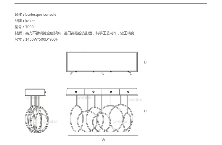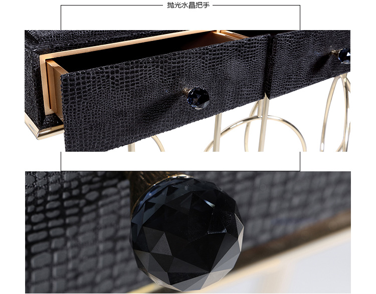 Burlesque console的设计灵感源于通过重新审视法国歌舞表演令人眼花缭乱的世界。在这四个抽屉里的每一个抽屉都是由一个散发异国风情的蛇皮扪面和黑色的水晶状拉手组成,底架由仿佛旋转着的金色环状不锈钢构成脚架,散发出一股活跃的女主角的神秘特质。