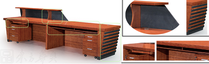 ※  上图为背面展示图,以及侧面斜度设计,厚实的中部支撑板,实木键盘架,铝合金拉手活动柜,个性设计前台双层板,巧妙的运用银色装饰条点缀,黑色亮光漆的设计造型,完美结合,尽显高档典雅!