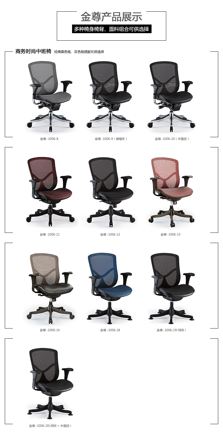 金尊系列覆盖了办公室所有用椅空间的需求,从主管、职员到访客,从办公到教育训练,皆有合适的椅型,可以说是最完整的产品组合设计