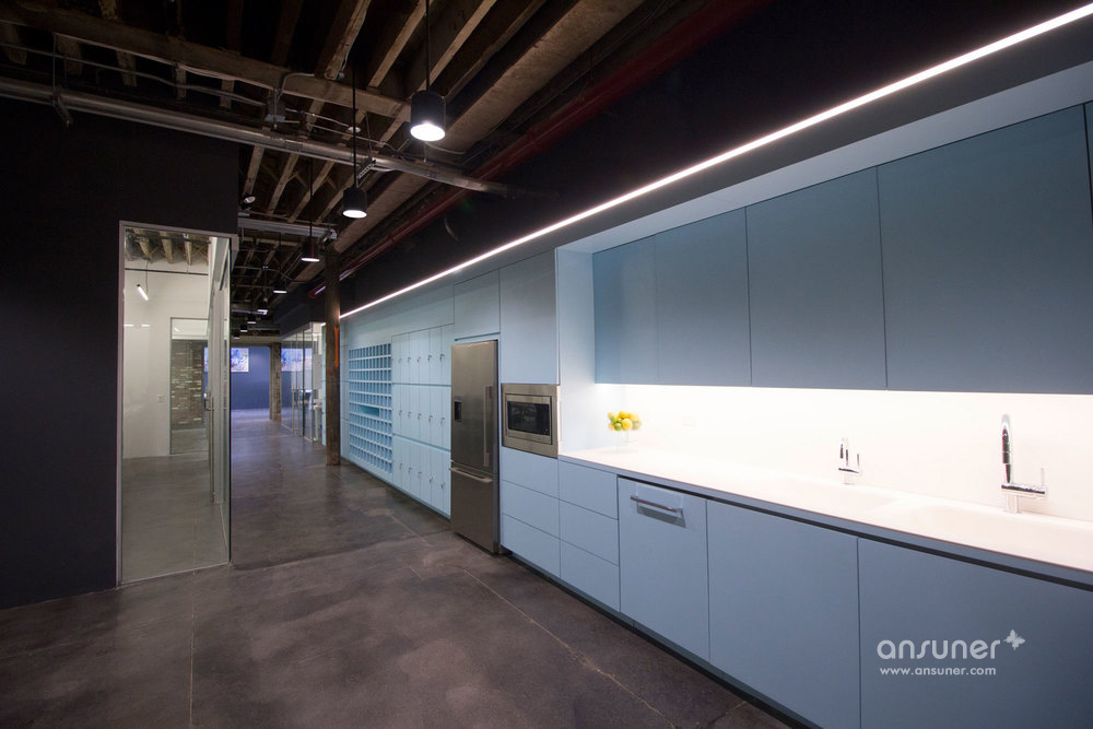 位于顶层的玻璃会议室以嵌入式灯带勾勒出一个有趣的光影空间。而底楼的空间,则通过狭长的屋顶天窗引入明媚天光,结合纯净的白色工作台,营造出开敞舒适的工作氛围。