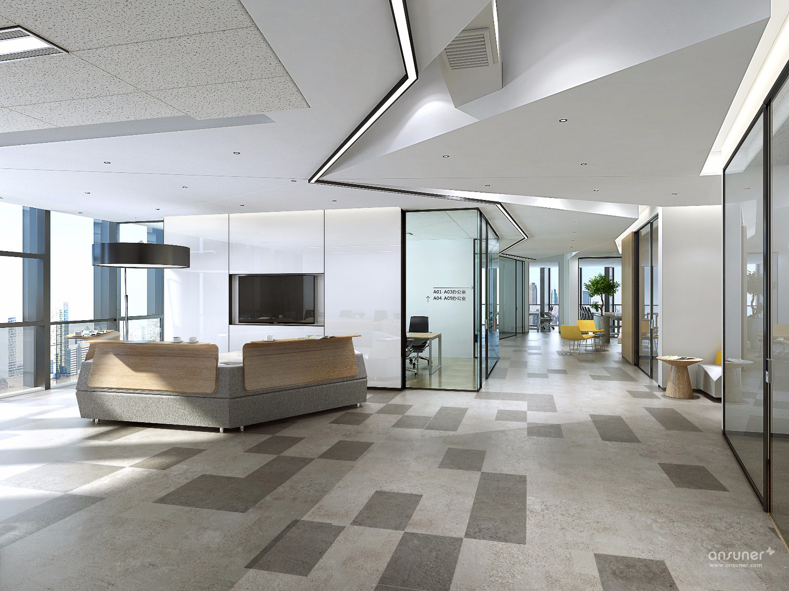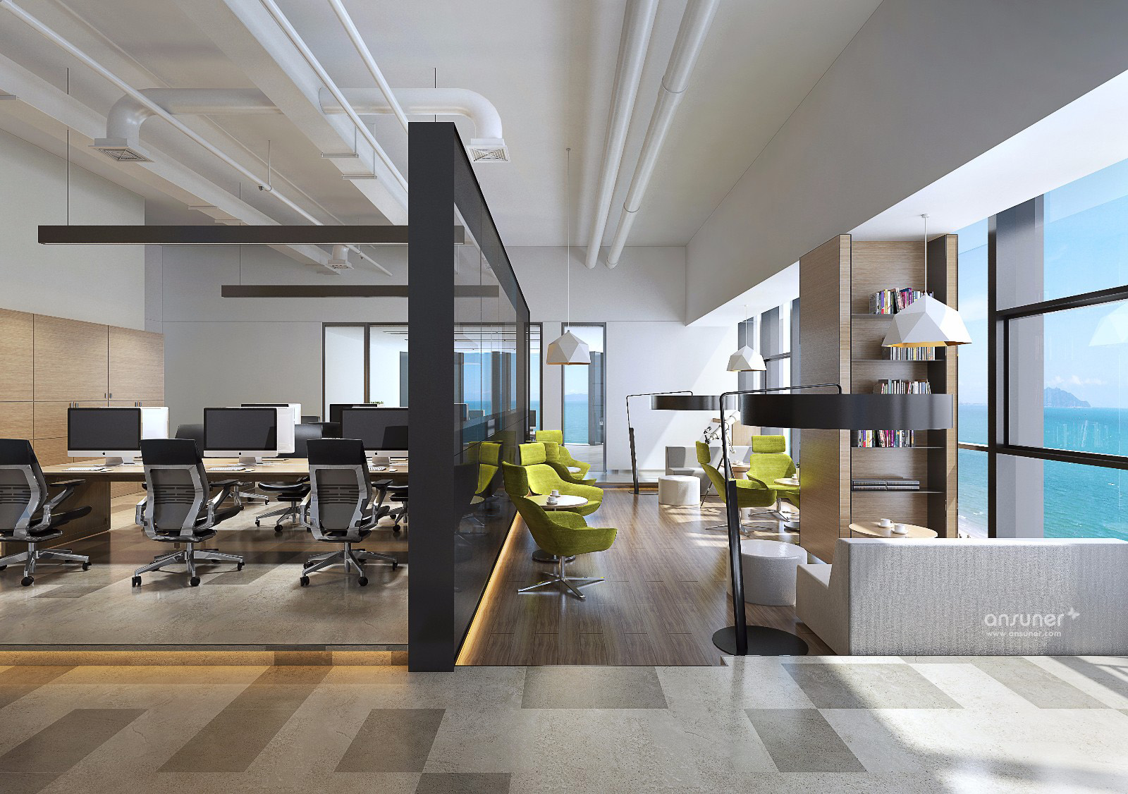 云行为不可见造成行为自由,而行为的自由却是由秩序来保证的,所以不可见的自由反而会以可见的秩序形成节奏,节奏形成美和品质。以可见的秩序与不可见的自由作为骨架,构建出的智慧空间,即拥有 “随处可以办公,随处不可办公”的独特特质。这种设计指导思路完全颠覆了传统办公空间的规则。